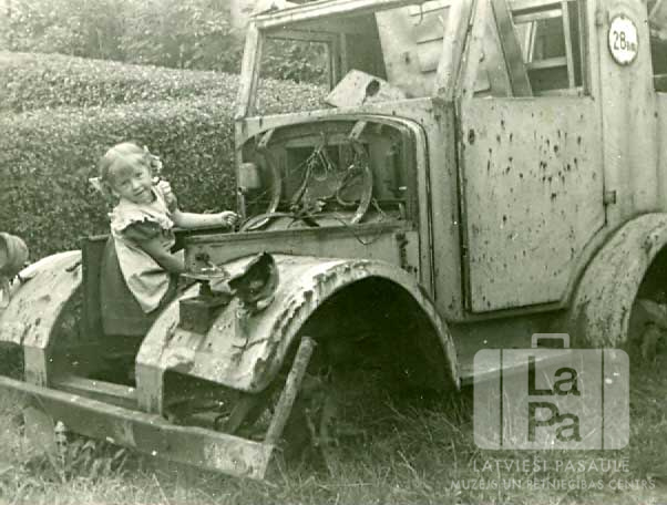Ināra Stepe (pr. Apinis) bērnībā pie vecas mašīnas vraka Šlēsvigā (angļu zonā) 1946. gada vasarā. Par šo gadījumu Ināra Apinis (dz. Stepe) atceras: "Nekādas rotaļlietas nebija paņemtas līdz no Latvijas, iztikām ar kaŗā bojātiem vrakiem."
