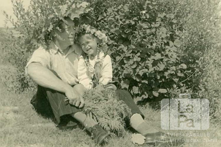 Tēvs ar meitu ar vainagiem uz galvas sēž zālē netālu no Gotorfas nometnes pie Šlēsvigas (angļu zonā), gatavojoties Līgo vakaram. Vīrietis rokās tur paparžu pušķi. Fonā krūms. No kreisās: Arvīds Stepe, Ināra Stepe (pr. Apinis).