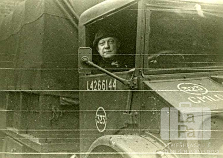 Arvīds Stepe formastērpā pie stūres smagajā mašīnā britu militāro vienību 323. "melno” transporta vienībā Bokhomā (angļu zonā).