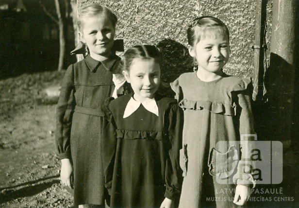 Trīs mazas meitenes stāv pie mūra ēkas stūra Neištates nometnē (Holšteinā, angļu zonā) 1949. gada vasarā. Fonā ir redzama daļa pagalma un cita nometnes ēka. No kreisās: Māra Ābele, Irēne Briede un Ināra Stepe (pr. Apinis).