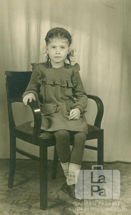 Ināra Stepe (pr. Apinis) bērnībā sēž uz krēsla Neištates nometnē (Holšteinā, angļu zonā). Fonā aizkars.