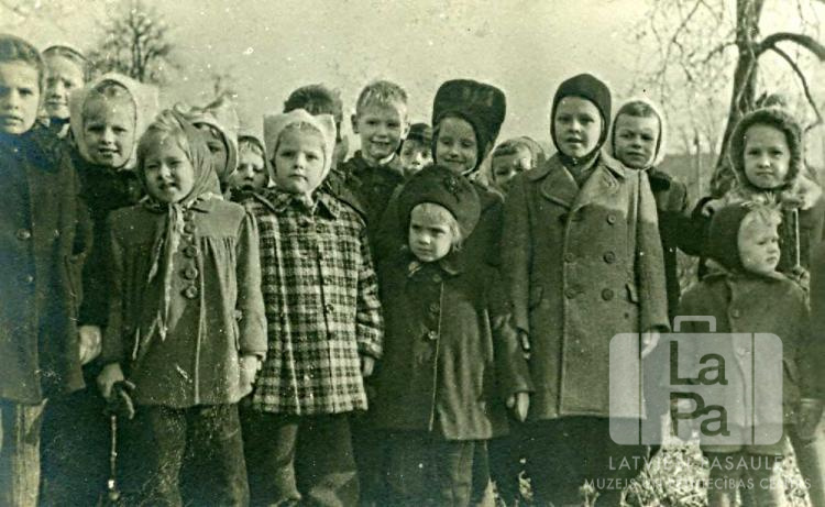 Bērnudārza bērni ziemā Neištates nometnē (Holšteinā, angļu zonā) 1949. gada ziemā. Visi bērni ir ģērbušies mēteļos, virs bērnu galvām ir redzami pāris koki. Otrajā rindā, pirmā no labās: Ināra Stepe (pr. Apinis).