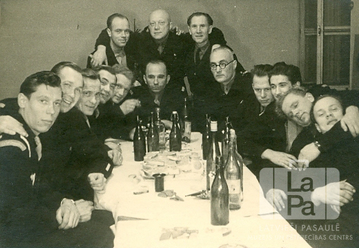 Britu militāro vienību 323. "melno” transporta vienības vīri formastērpos pie svētku galda Bochomā (angļu zonā), gaidot 1949. gadu. Uz galda ir šķīvji ar sviestmaizēm un vairākas pudeles. Labajā telpas pusē ir logs. Galda galā sēž: Kārlis Kaķis, viņam pa kreisi: Rūdolfs Krūmiņš. No K. Kaķa otrais pa labi: Arvīds Sijāts. Stāv vidū: Arvīds Stepe.