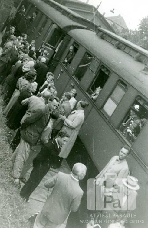 Cilvēku grupa pie vilciena Bergedorfas dzelceļa stacijā pie Ventorfas nometnes (angļu zonā) 1950. gada vasarā. Lielākā daļa cilvēku stāv pie vilciena, vairāki cilvēki ir redzami vilciena logos.
