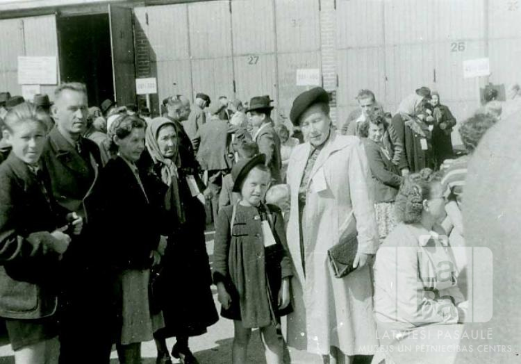 Cilvēku grupa pie lielas ēkas Gronā pie Brēmerhāfenes (angļu zonā). Cilvēki ģērbušies mēteļos, tiem pie apģērba ir gaišas birkas. Priekšplānā, no kreisās: pirmais Pauls Ozoliņš, otrais Pēteris Ozoliņš, trešā Alma Ozoliņa, ceturtā Emma Paulīne Stepis, piektā Ināra Stepe (pr. Apinis) un sestā Agnese Stepe (gaišā mētelī, ar tumšu cepuri). Par šo gadījumu Ināra Apinis (dz. Stepe) atceras: "Oficiālās izceļošanas zīmes pie krūtīm, mēs gaidām uz transportu, kas mūs aizvedīs uz kuģi."