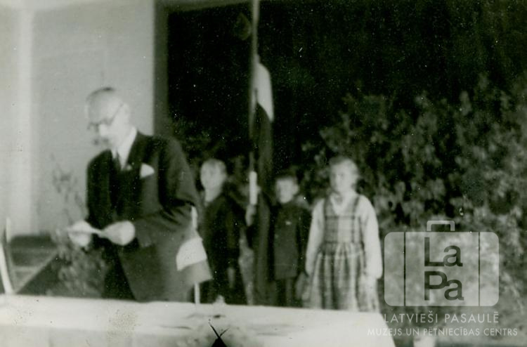 Artūrs Lācis veic uzrunu pamatskolas izlaiduma akta laikā Vurcahas nometnē (franču zonā) 1946. gada pavasarī. Aiz viņa, blakus Latvijas karogam, goda sardzē stāv bērni – divi zēni un viena meitene. A. Lācim priekšā uz galda ir mazs Latvijas karogs. Telpa ir izdekorēta ar meijām – koku zariem. Pirmais no kreisās: Artūrs Lācis.