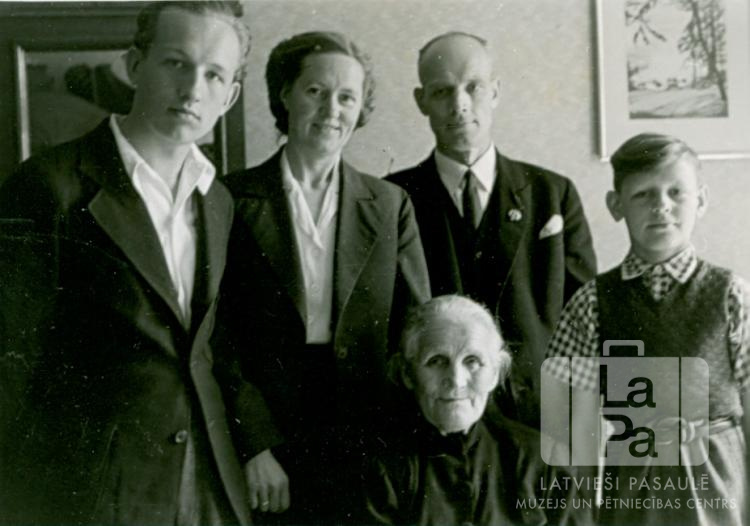 Lāču ģimene Vurcahas nometnē (franču zonā). Priekšā: Marija (Lāce ?). Fonā pie sienas ir redzamas divas gleznas. Aizmugurē, no kreisās: Indulis Lācis, Ella Lāce, Artūrs Lācis un Gatiņš Lācis.