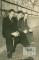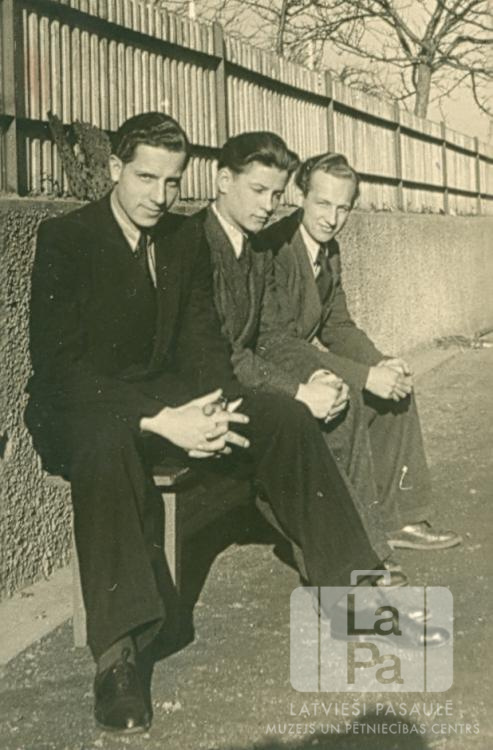 Trīs puiši no latviešu ģimnāzijas uzvalkos sēž uz koka sola Ēbenveileres nometnē (franču zonā). Aiz muguras jauniešiem ir mūra siena, tās augšpusē ir koka žogs. No kreisās: Ģirts Saulītis, Ivars Kizāns un Indulis Lācis.
