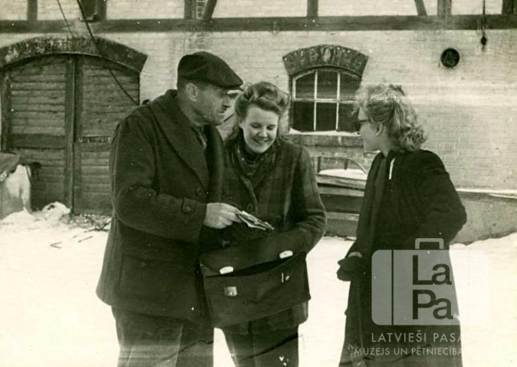 Ēbenveileres nometnes latviešu ģimnāzijas (franču zonā) zēnu internāta pārzinis sarunājas ar divām ģimnāzistēm 1948. gada ziemā. Visi trīs ir ģērbušies mēteļos, vīrietim rokās ir atvērts portfelis un dokumenti; uz zemes ir sniegs. Fonā ir mūra ēka ar koka sijām, lielām durvīm kreisajā pusē un logu sienas vidū. No kreisās: Kārlis Kevietis, Inese Ceichene un Silvija Fridrichsone.