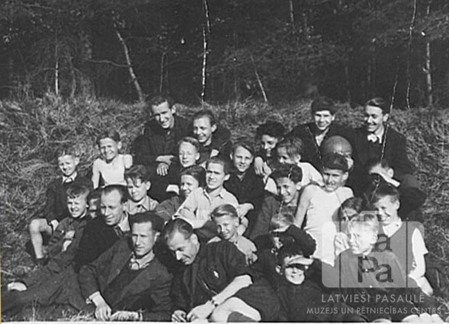 Skautu grupa no Mēsenes nometnes Lībekā (angļu zonā) sēž zālē meža skrējiena dienā. Fonā ir mežs. Otrajā rindā no kreisās: Harijs Bergs (vadītājs), Kārlis Riekstiņš (vidū, baltā kreklā), Guntis Nātre, Arnis Mikus (baltā apakškreklā), nezināms, Juris Blumfelds (tumšā vestē). Aiz G. Nātres sēž Vilnis Matisons. Aiz K. Riekstiņa sēž Indulis Liepiņš (skatās sāniski), aiz I. Liepiņa sēž Imants Sulainis, pa labi no K. Riekstiņa sēž Juris Milts (tumšā kreklā). Aizmugurē, kreisajā pusē, ir redzams Olavs Stumbris (dzejnieks), viņam blakus Harijs Elviks. Aizmugurē, labajā pusē ir redzams Verners Krūmiņš."