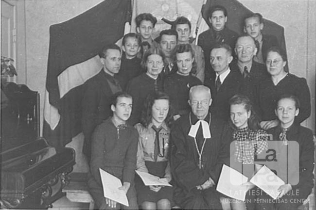 Skolēni un pieaugušie, skolēniem beidzot pamatskolu "Sidrabenes" nometnē, Lībekā (angļu zonā). Skolēni priekšējā rindā rokās tur dokumentus, viņiem pa vidu sēž mācītājs tērpā. Kreisajā pusē ir klavieres, aiz grupas ir Latvijas valsts karogs. Pirmajā rindā, no kreisās: Kārlis Riekstiņš, Vija Blumfelde, nezināms (mācītājs), Ilona Leimane, Indulis Liepiņš. Otrajā rindā, no kreisās: Kārlis Valters Liepiņš, Elizabete Liepiņš, ? Blumfelda, ? Izands (skolas pārzinis), ? Vinters (Arnolds Brīvulis?), ? Izanda. Trešajā rindā ir redzams: Vilnis Matisons. Ceturtajā rindā, no kreisās: Guntis Nātre, Marija Ješčenko, nezināms, Arnis Mikus.