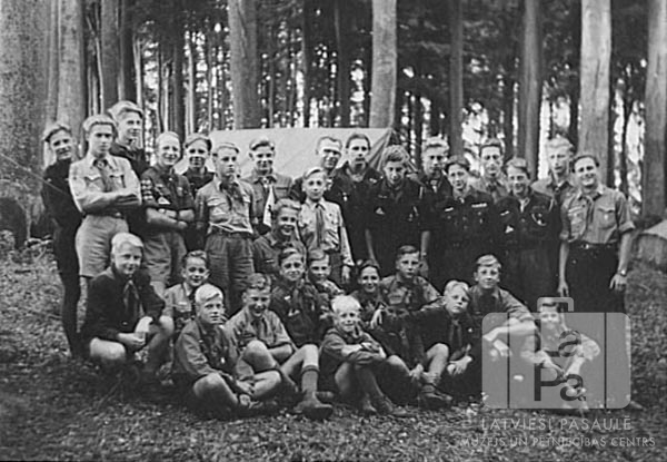 Latviešu skautu grupa no Lībekas (angļu zonā) lietuviešu skautu nometnē "Timmendorfer Strand", netālu no Lībekas. Nometne notika par godu 30 gadu Lietuvas skautu kustības dibināšanas atcerei. Visi zēni ir ģērbušies skautu formastērpos. Fonā teltis un mežs. Priekšā, no kreisās: otrais Vilnis Matisons, trešais Gunārs Drulle, ceturtais Emīls Elstiņš, piektais Rudolfs Nemme, sestais Ivars Lācītis, septītais Ivars Medenieks, astotais ? Grīnbergs, devītais Edvīs ?. Tupus vidū: Vitālijs Kvass. Aizmugurē, no kreisās (stāv): nezināms, Kārlis Riekstiņš, Ēriks Čūls, Imants Sulainis, Indulis Liepiņš, Juris Milts, Aivars Brūns, Juris Graudiņš, ? Medenieks (vadītājs), Uldis Lapiņš, Rolānds Neijs, Vilnis Balodis, Guntis Lāma, ? Gredzens (vadītājs), Arnis Hildebrants, ? Bunķis (vadītājs) un ? Vilpors.