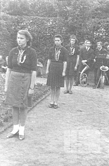 Lielgaidu goda sardze pie latviešu pieminekļa atklāšanas "Vorwerk" kapos Lībekā (angļu zonā). Aizmugurē stāv muzikanti ar uz zemes novietotiem instrumentiem. Fonā augsts dzīvžogs. Priekšplānā, no kreisās (trīs lielgaidas): Vija Bangerska, Daina Sudraba un Dzidra Lazdiņa.