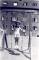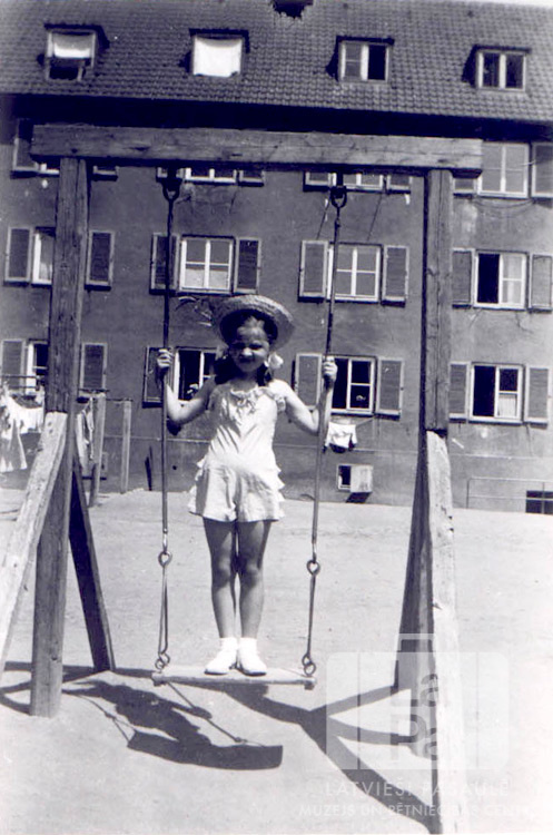 Ingeborga Saulīte bērnībā stāv uz šūpolēm Eslingenē (amerikāņu zonā) ap 1949. gadu. Meitenei matos ir lentes, ģērbusies gaišā kleitā un kurpēs. Galvā cepure. Fonā ir vairākstāvu dzīvojamā mūra ēka, tās priekšā ir uz auklas izkārta veļa. Foto autors: Emīlija Lapiņš (dz. Krūze).