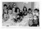Zēni un meitenes sēž ap galdu Ingeborgas Saulītes 5 gadu dzimšanas dienas svinībās Eslingenes nometnē (amerikāņu zonā). Kreisajā pusē viens zēns stāv aiz sēdošajiem. Visi bērni ģērbušies svinīgās drēbēs, vairākām meitenēm matos ir lentes. Uz galda ir trauki, ēdiens un ziedi. Fonā, labajā pusē, ir logs. Pie galda ir redzami, no kreisās: nezināms, Pēteris Kaķis, Juris Kaķis, nezināms (Ģenerāļa Klinsona meita), Ieva Lēmanis, Ingeborga Saulīte (galda galā), Pēteris Lēmanis, Māra Robežgruntnieks, Olita Kaķis, Irēne Kēse-Sade, Maija Bencis. Foto autors: Emīlija Lapiņš (dz. Krūze). Inga Ķirsons raksta: "Kā redzat, bija "Samel tases uz galda un arī kliņģeris". DP nometnē laikam nemaz tik grūti negāja!"