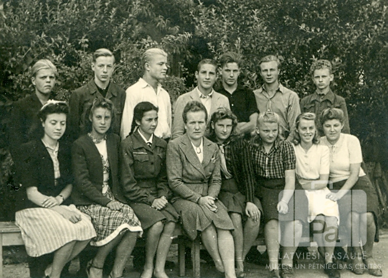 Ģimnāzijas 2. klases jaunieši ar klases audzinātāju Ausmas nometnē Kleinkecā (amerikāņu zonā). Priekšā meitenes un skolotāja sēž uz koka sola. Aizmugurē puiši stāv kājās. Fonā ir krūmi. Pirmajā rindā, no kreisās: Gunta Bruzila, Larisa Zviedre, Austra Antone, Nora Klīve (klases audzinātāja), Ērika Brasle, Venta Soduma, Marga Rozīte un Ilga Soste. Aizmugurē stāv, no kreisās: Jānis Dzenis (mazais Juhans), Gleba Mamantovs, Jānis Dzenis (lielais Juhans), Fredis Gāliņš, Varimants Plūdonis, Ādams Sils un Jānis Lauva.