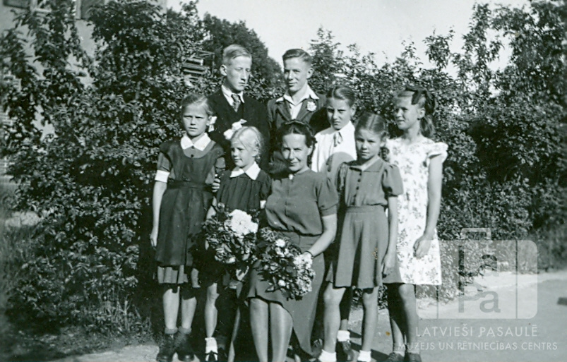 Klavierskolotāja ar saviem skolēniem Ausmas nometnē Kleinkecā (amerikāņu zonā). Sievietei un meitenei kreisajā pusē ir rokās ziedi. Aizmugurē krūmi, caur tiem kreisajā pusē ir redzama mūra ēka. Priekšā, no kreisās: Elizabete Biteniece, Māra Putniņa, Vaida Silis (skolotāja) un Ingrīda Lemberga (pr. Irani). Aizmugurē, no kreisās: pirmais H. Jancis, otrais Gļebs Mamantovs.