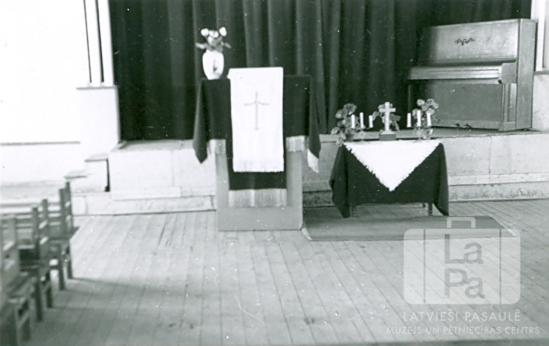 Sabiedriskā zāle Ausmas nometnē Kleinkecā (amerikāņu zonā), kur noturēja latviešu evaņģēliski luteriskās draudzes dievkalpojumus. Altāris, tam kreisajā pusē galds ar svecēm. Aizmugurē skatuve, kuras labajā pusē ir klavieres. Pārējā skatuves daļa ir aizklāta ar aizkariem. Priekšplānā, kreisajā pusē, redzami soli.