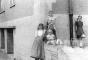 Trīs meitenes un vecāka kundze ar bērniņu uz paaugstinājuma pie mūra ēkas stūra Švābu Gmindes nometnē (amerikāņu zonā). Kreisajā pusē redzami ēkas logi. Apakšā stāv: Anita Liepiņa. Augšā stāv, pirmā no kreisās: Lilija Šulcs.