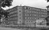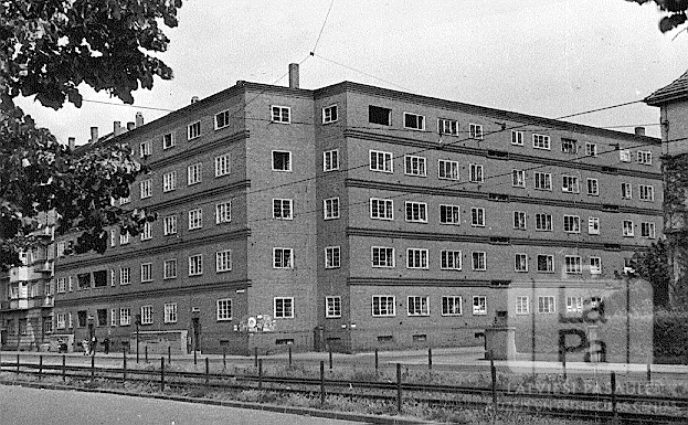 Bloku māja Manheimas nometnē (angļu zonā) ap 1947. gadu. Ēkai ir pieci stāvi, priekšā ceļš un tramvaja (?) sliedes.