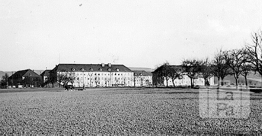 Vairākstāvu mūra ēkas Švābu Gmindes nometnē (amerikāņu zonā) ap 1949. gadu. Priekšplānā ir liels, uzarts lauks.