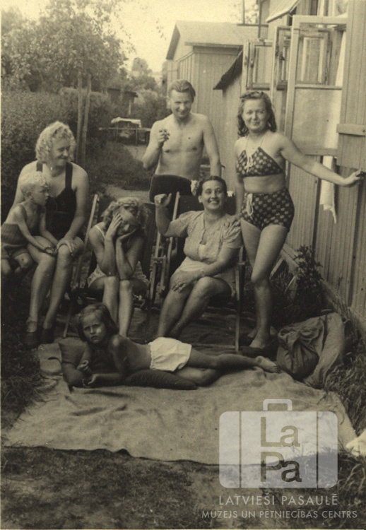 Cilvēku grupa šaurā ejā pie vienstāvu koka barakas Rīgas nometnē pie Lībekas (angļu zonā) 1946.–1947. gadā. Lielākā daļa cilvēku ir ģērbusies peldkostīmos. Kreisajā pusē ir dzīvžogs, aizmugurē redzama vēl viena koka baraka. Priekšā guļ: Ilze Vizbulis. Otrajā rindā, no kreisās: Leons Kārkliņš, Tamāra Sviķers Kārkliņa, Ida Ļuba Karpovs, Emma Vizbulis un Vilma Zītars. Aizmugurē stāv: Jānis Strods.