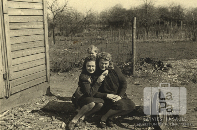 Divas sievietes un maza meitene pie koka barakas Rīgas nometnē pie Lībekas (angļu zonā). Fonā iekopts neliels zemes gabals un koki, krūmi bez lapām. Priekšā, no kreisās: No kreisās: Vilma Zītars un Ida Karpovs. Aizmugurē: Irēne Karpovs (pr. Būcēns).