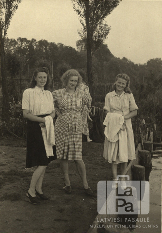 Trīs sievietes no Rīgas nometnes pie Lībekas (angļu zonā) stāv ūdens malā izbrauciena laikā pie ezera. Fonā mežs. No kreisās: Ausma Kligins, Tamāra Kārkliņa Svīķers, Ida Karpovs.