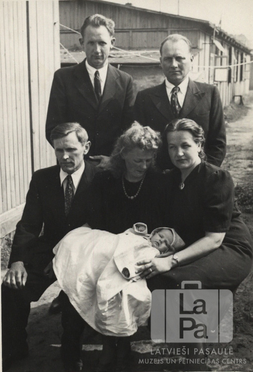 Pieaugušie ar kristībām sapostu bērnu Rīgas nometnē pie Lībekas (angļu zonā). Pieaugušie ģērbušies tumšās drēbēs, bērns ir gaišā apģērbā. Fonā ir vienstāvu koka baraka – vecās armijas kazarmas. Priekšā: Anda Liberis (bērns gaišās drēbēs). Otrajā rindā, no kreisās: Jānis Liberis, Ida Karpovs, Velta Liberis.