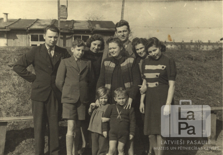 Cilvēku grupa stāv pie koka sola Rīgas nometnē pie Lībekas (angļu zonā). Aizmugurē ir zemes uzbērums, aiz tā ir redzama vienstāvu koka baraka. Priekšā (bērni): Irēne Karpovs (pr. Būcēns), Raimonds Neijs. Otrajā rindā, no kreisās: Jānis Strods, Rolands Neijs, Lidija Neijs, Vilma Zītars, Jānis Lejnieks, nezināms, Ruta Neijs."