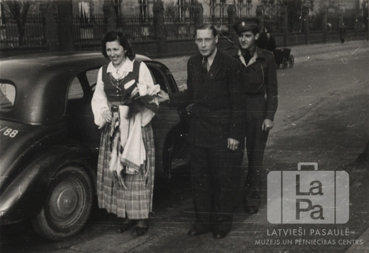 Roku pāris kāzu dienā Lībekā (angļu zonā). Sieviete tautastērpā smaidot stāv pie atvērtām automašīnas aizmugurējām durvīm, viņu aiz rokas pietur vīrietis uzvalkā. Aiz viņa stāv vīrietis armijas (?) formastērpā. Fonā iela, pretējā ielas pusē mūra un metāla žogs ar ēku aiz tā.