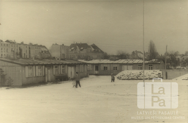 Nometnes skats ziemā Rīgas nometnē pie Lībekas (angļu zonā). Divas vienstāvu koka barakas, labajā pusē apsnidzis bunkurs. Priekšplānā ir laukums ar karoga mastu. Pa laukumu pārvietojas cilvēki. Fonā ir vairākstāvu dzīvojamās ēkas. Zemi klāj sniegs.