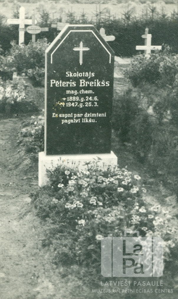 Pētera Breikša kaps ar kapa pieminekli Zēdorfā (angļu zonā). Uz kapakmens rakstīts: "Skolotājs/ Pēteris Breikšs/ mag.chem./ 1889.g.24.6./ 1947.g.26.3./ Es sapni par dzimteni / pagalvī likšu."