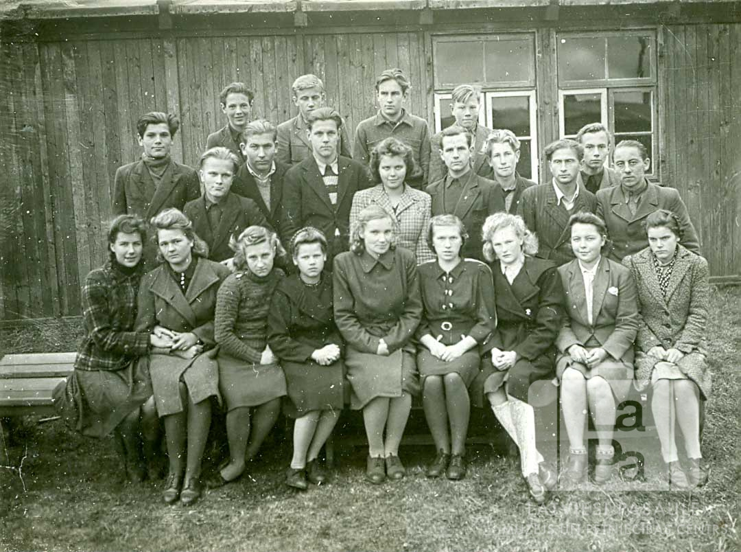 Andreja Pumpura ģimnāzijas 1947. gada 1. klase pie vienstāvu koka barakas Zēdorfas nometnē (angļu zonā). Priekšējā rindā sievietes sēž uz koka sola, aizmugurējās divās rindās puiši stāv kājās. Fonā koka ēkas divi logi. Otrajā rindā, pirmais no kreisās (ar gaišiem matiem): Ivars Breikšs.
