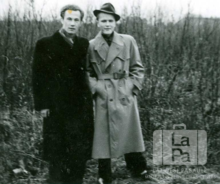Divi vīrieši – brālēni – mēteļos pie Emdenes nometnes (angļu zonā). Fonā krūmājs. No kreisās: Jānis Gargurns un Ivars Breikšs. Uz fotogrāfijas aizmugures rakstīts: "Man nav plikas kājas, bet te skaidri var redzēt, ka manas tupelītes smejas."