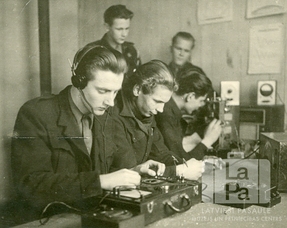 Pieci latviešu tehniskās ģimnāzijas elektriskās un radio zinātņu klases skolnieki praktisko darbu stundā Feldenē (angļu zonā), darbojoties ap elektriskajām ierīcēm. Vienam puisim uz ausīm ir austiņas. Pirmais no kreisās: Arnolds Vilkens. Aizmugurē, otrais no kreisās (atspiedies pret sienu): Ivars Breikšs.