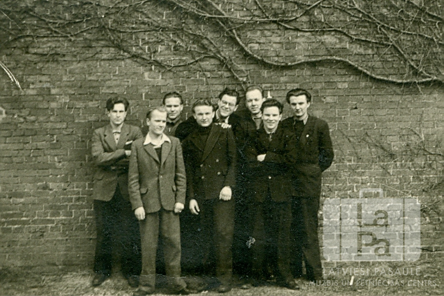 Latviešu tehniskās ģimnāzijas trešās klases puiši stāv pie vīteņaugiem apaugušas sienas Ferdenē (angļu zonā). Grupā ir redzami: Ansis Sapraša, Ivars Breikšs un Arnolds Vilkens (labajā pusē).