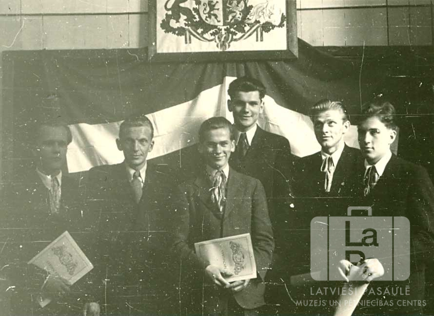Seši latviešu tehniskās ģimnāzijas pēdējā izlaiduma elektriskās klases absolventi Fērdenē (angļu zonā). Visi seši puiši ir ģērbušies uzvalkos, vairākiem no viņiem rokās ir diplomi. Fonā pie sienas ir Latvijas valsts karogs un ģerbonis. No kreisās: Ivars Breikšs, Andrejs Puriņš, Dzintars Sproģis, Ilgvars Blaus, Edgars Eglītis un Ansis Sapraša.