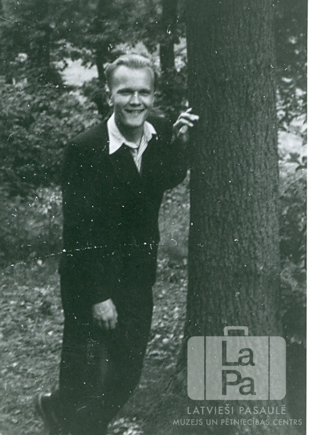 Ivars Breikšs pie koka Ventorfā (angļu zonā). Fonā mežs. Par šo gadījumu Ivars Breikšs atceras: "Kamēr izceļošanas lēnie rati (veselības, politiskās un vīzas pārbaudes) griežas– ko darīt? Pastaigājos par pilsētiņas parku."