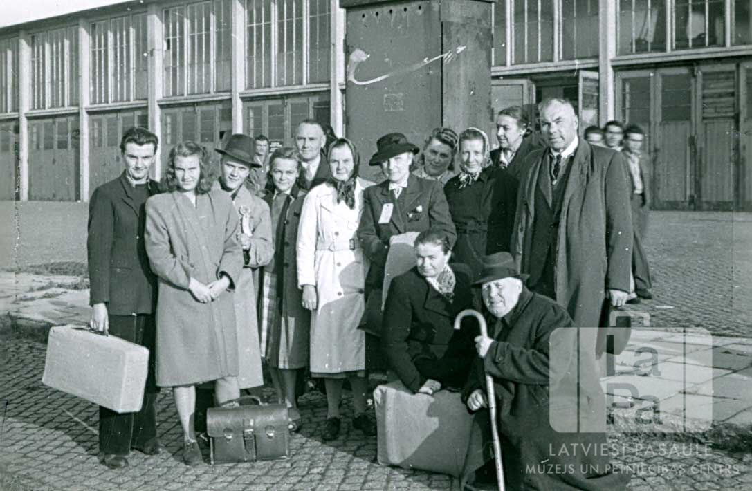 Cilvēku grupa pie ēkas Ventorfā (angļu zonā) 1950. gada rudenī. Cilvēki ir ģērbušies mēteļos, priekšā ir vairāki čemodāni. Ar gaišām izceļošanas zīmēm pie mēteļa, no kreisās: Ivars Breikšs un Marta Breikšs.