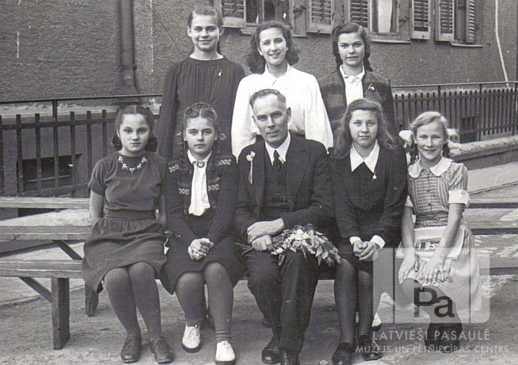 Meiteņu grupa kopā ar savas klases audzinātāju Jāni Paulu Jāņa Cimzes tautskolas izlaidumā Ingolštatē (amerikāņu zonā) 1947. gada pavasarī. Priekšējā rinda sēž uz koka sola. Aizmugurē ir redzamas vēl divas koka solu rindas. Fonā mūra ēka. Priekšā sēž, no kreisās: Ilona Krilova, Dzidra Rutka, Jānis Pauls (klases audzinātājs), Biruta Derkēvica un Ruta Osīte. Aizmugurē stāv, no kreisās: Rasma Sudmale, Ruta Ozoliņa un Ruta Taube.