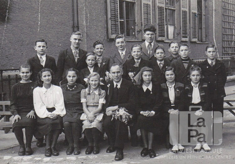 Skolēni kopā ar klases audzinātāju Jāni Paulu Jāņa Cimzes tautskolas izlaidumā Ingolštatē (amerikāņu zonā) 1947. gada pavasarī. Priekšējā rinda sēž uz koka sola. Aizmugurē ir redzamas vēl divas koka solu rindas. Fonā mūra ēka. Priekšā sēž, no kreisās: Rasma Sudmale, Ruta Ozoliņa, Viola Krilova, Ruta Osīts, Jānis Pauls (klases audzinātājs), Biruta Derkēvica, Ruta Taube, Dzidra Rutka. Aizmugurē stāv, no kreisās: Ivars Heniņš, Nikolajs Neilands, Aivars Kuplis, Juris Reinsons, Alberts Reske, Ģirts Merģins, Richards Sudmalis, Jānis Zālītis, Vilnis Nagliņš, Eduards Taube, Imants Zālītis.