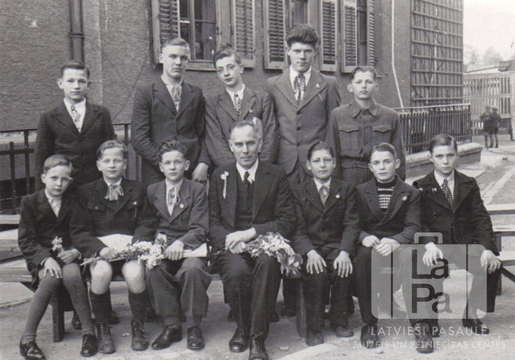 Zēnu grupa kopā ar savas klases audzinātāju Jāni Paulu Jāņa Cimzes tautskolas izlaidumā Ingolštatē (amerikāņu zonā) 1947. gada pavasarī. Priekšējā rinda sēž uz koka sola. Aizmugurē ir redzamas vēl divas koka solu rindas. Fonā mūra ēka un aiz ēkas stūra pastaigājas bērni. Priekšā sēž, no kreisās: Aivars Kuplis, Ģirts Merģins, Juris Reinsons, Jānis Pauls, Jānis Zālītis, Eduards Taube un Imants Zālītis. Aizmugurē stāv, no kreisās: Ivars Heniņš, Nikolajs Neilands, Alberts Reske, Richards Sudmalis, Vilnis Nagliņš.