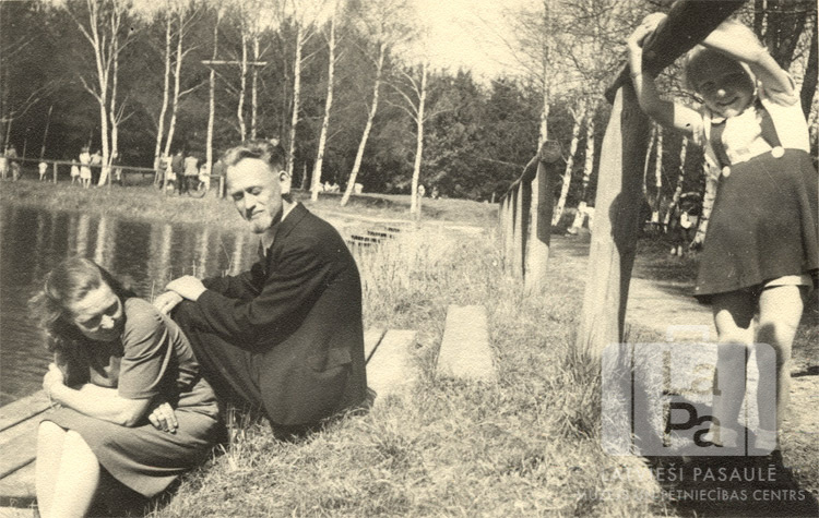 Pārumu pāris ar meitu bērnībā neliela ezera malā pie Filzekas nometnes (amerikāņu zonā) 1946. gada Lieldienās. Vecāki sēž uz koka kāpnēm kreisajā pusē, meita stāv pie koka pāļu žoga. Fonā, nelielā ezera citā malā, staigā cilvēki. Fonā ap ezeru ir mežs. No kreisās: Elza Pāruma, Jānis Pārums un Edīte Pāruma.