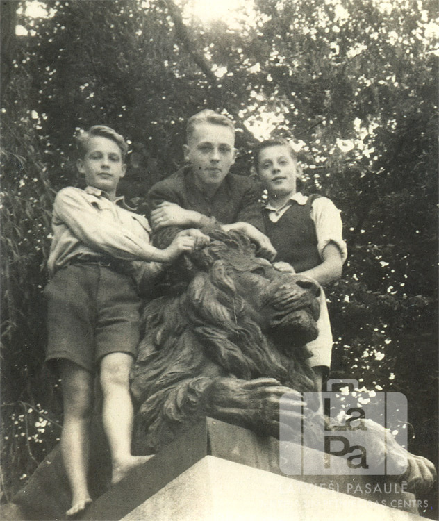 Trīs zēni stāv uz lauvas pieminekļa Rēgensburgā (amerikāņu zonā). Fonā koki. No kreisās: Ivars Pārums, I. Barzdēvics, G. Tereško.