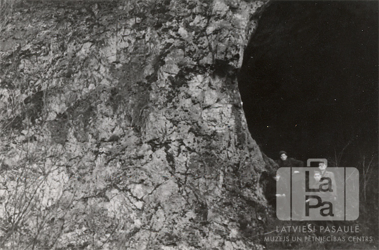 Četri zēni no Rēgensburgas nometnes (amerikāņu zonā) pie lielas alas ieejas ap 1948. gadu. Alas kreiso malu veido liela klints. Attēlā redzami: J. Tereško, Ivars Pārums un ? Abulis.