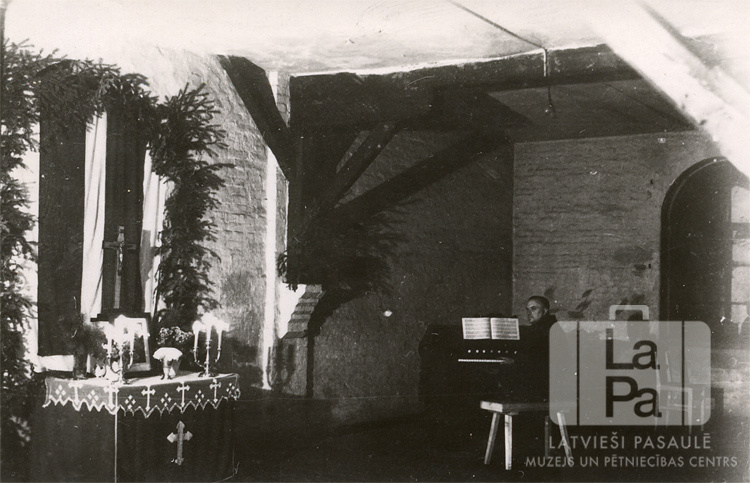 Baznīcas altāris Rēgensburgas nometnē (amerikāņu zonā) ap 1948. gadu. Kreisajā pusē baznīcas altāris ar svecēm un koka krustu. Uz sienas aiz altāra karājas Latvijas valsts karogs, ap to ir egļu zaru vainags. Telpas vidū ir atsegtas koka sijas, telpas labajā pusē pie ērģelēm sēž ērģelnieks ? Mūrnieks.