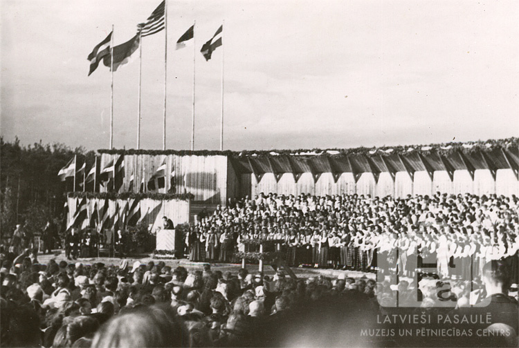 Dziesmu svētku estrāde Fišbahā (amerikāņu zonā). Estrādes kreisajā pusē augstu mastos plīvo pieci karogi, tostarp divi Latvijas valsts karogi, viens Lietuvas, viens Igaunijas un viens ASV karogs. Pa labi no karogiem estrādē dzied koristi tautastērpos, to vidū arī Rēgensburgas nometnes koris. Priekšplānā ir skatītāji.