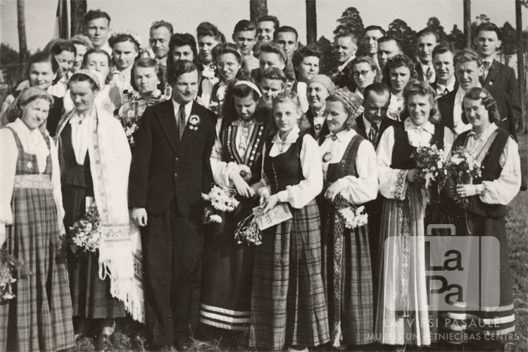 Grupa koristu tautas tērpos, priekšu rindā sievietes un vīrietis tumšā uzvalkā