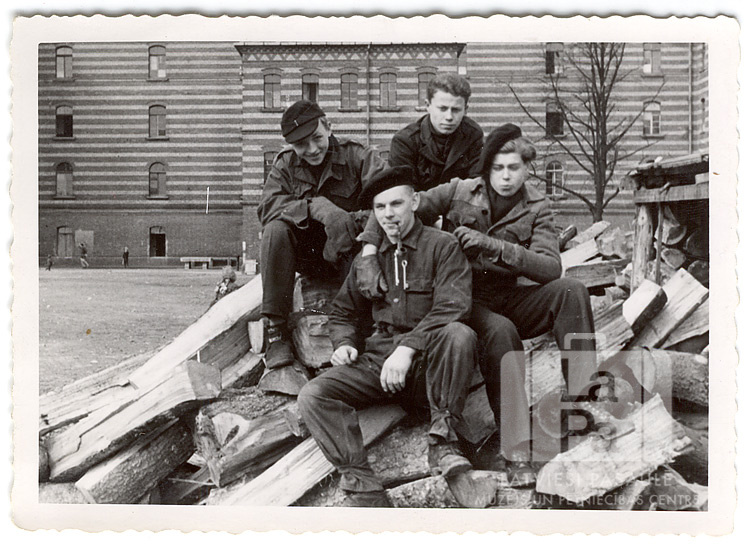 Četri puiši uz skaldītas malkas kaudzes Rēgensburgā (amerikāņu zonā) ap 1948. gadu. Puisim priekšā mutē ir pīpe. Fonā koks bez lapām un vairākstāvu mūra ēka. Attēlā redzami: I. Barzdēvics, nezināms, V. Drobiševskis, ?Sarkangalvis.